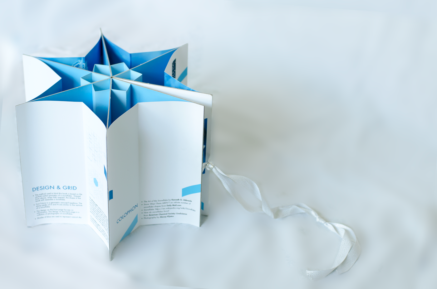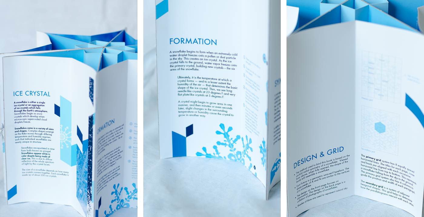 The book is designed and produced for introducing the Snow Flake. The shape and binding of the book, also the grid on which the text was organized and inspired by a snow flake.